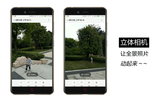 如果你顺着顺时针方向/反方向旋转手机上时,奇妙的事儿发生了——nubiaZ17mini可以从不一样视角显示信息全景图实际效果,也可根据拖动显示屏转换角度。这时,立体照片从“视頻”变成“全景照片”。